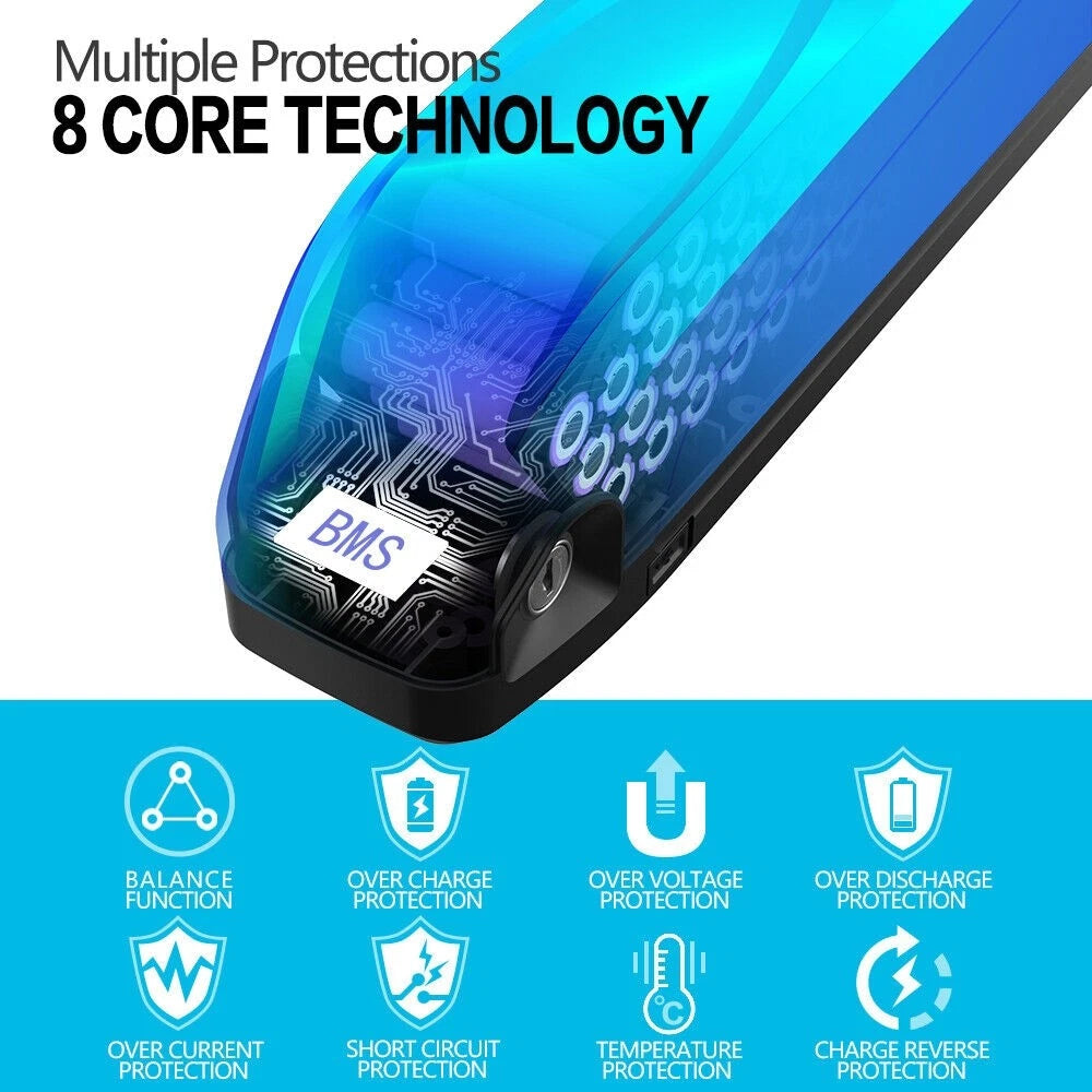 Battery Type: Down Tube Lithium-ion Battery , constructed with internal BMS with overcharge, over-discharge, over current protection and short circuits proof circuit board