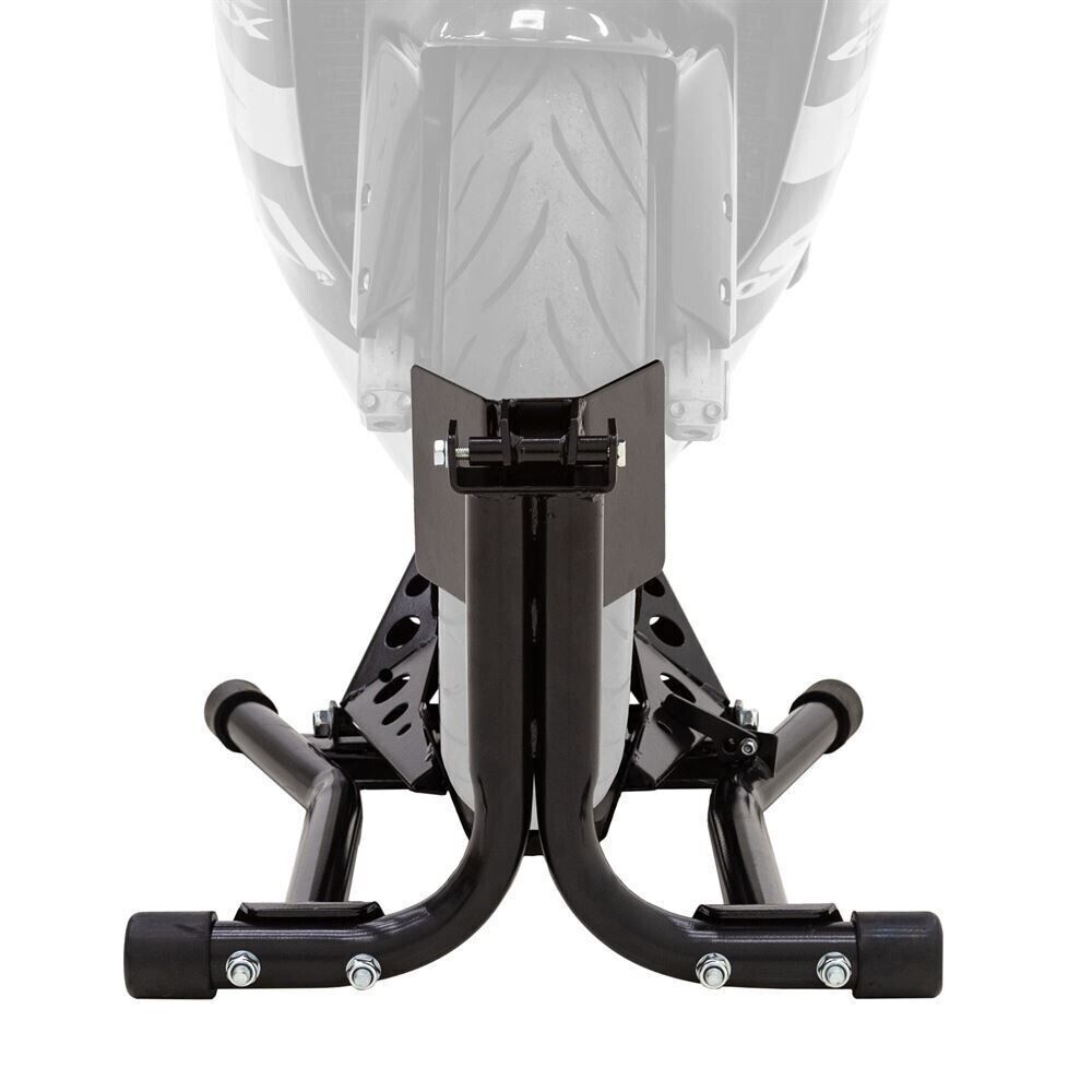 - Secures and holds a motorcycle in the upright position